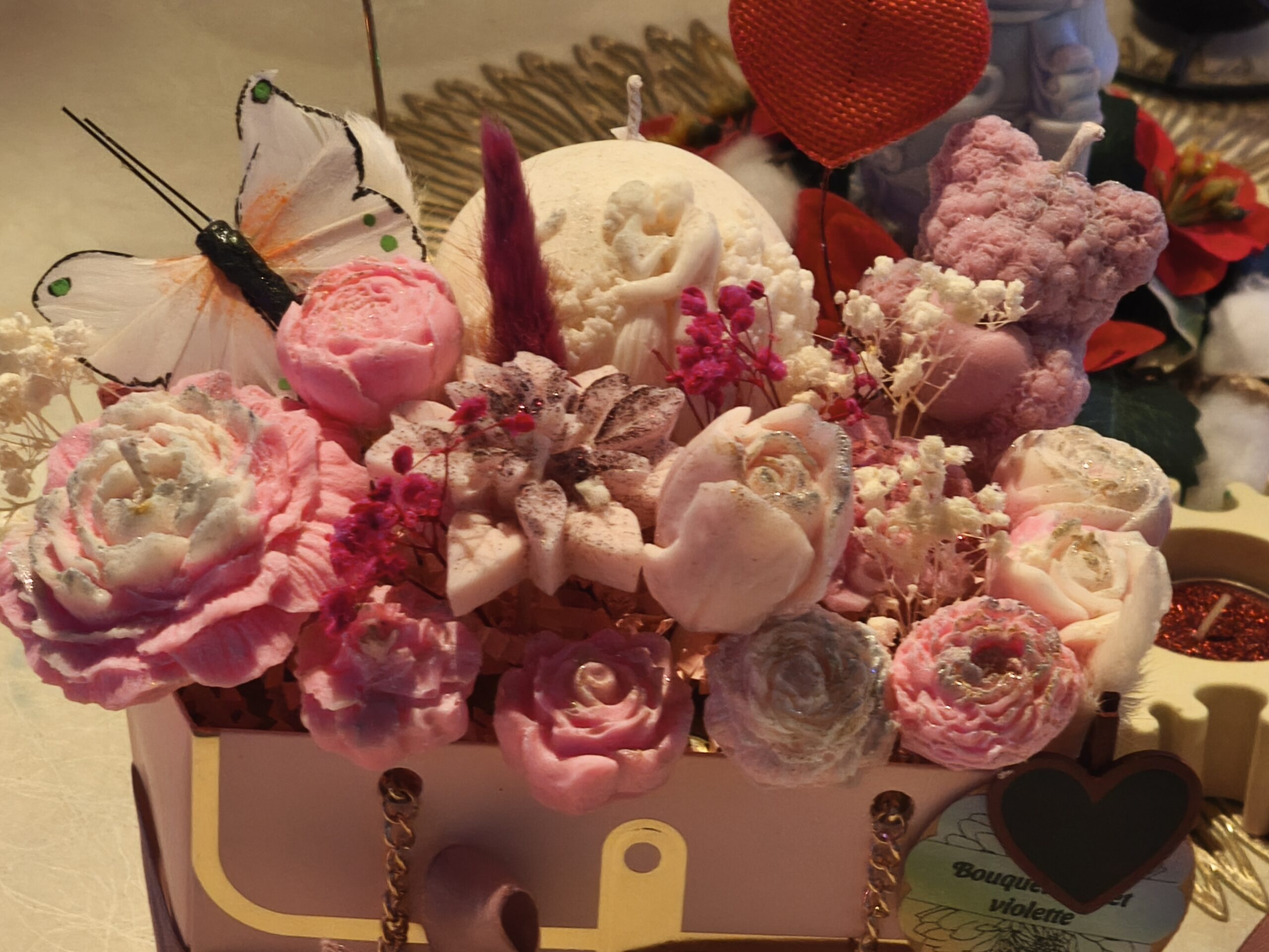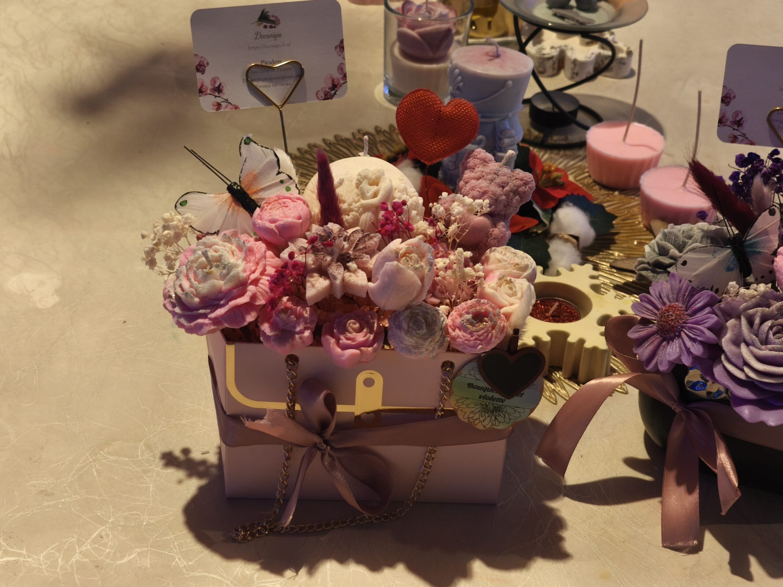 💖 Offrez un Bouquet sac à main Saint-Valentin unique avec une bougie cœur au parfum rose et violette, un mini fondant, une boule de bain effervescente et un stylo élégant. Un cadeau romantique prêt à surprendre et séduire.